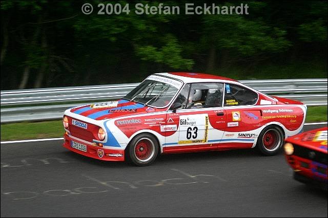 Das Rennen am 11.06.2004 im Rahmen des int. ADAC Das Rennen wurde von allen Teilnehmern, wegen der immer wieder wechselnden Wetterverhältnisse, als das bisher schwierigste 500km Rennen in der Geschichte der Youngtimertrophy bewertet. Da wir auf nasser Fahrbahn noch keine Erfahrung mit dem Auto und den Regenreifen hatten, sind auch wir mit einem großen Fragezeichen auf der Stirn in die Eifel gefahren. Nach dem 1. Trainingslauf auf nasser Fahrbahn waren aber sämtliche Bedenken verfolgen, weil das Auto absolut perfekt auf der Straße lag. Der Start im Trockenen und die ersten Rennrunden liefen perfekt. Leider machten wir nach einsetzendem Gewitterregen in Runde 9 - und slickbereift unterwegs - eine Bekanntschaft mit der Planke. Wir konnten uns nur noch mit geringer Geschwindigkeit, verbogener Vorderachse und Felge mit letzter Kraft in die Box schleppen. Da wir bereits durch einen Trainingsunfall unsere hinteren Regenreifen eingebüßt hatten, wurden die vorderen schmalen Regenreifen auf die Hinterachse montiert und auf der Vorderachse handelsübliche Straßenreifen. Trotz dieser Mischbereifung und der verstellten Spur konnten wir uns Gesamtplatz 131 (von 220 Startern) und Platz 2 in der Klasse sichern. Auch den Abstand zu den Klassenschnellsten konnten wir in diesem Jahr wiederholt halbieren. Während wir im letzten Jahr zu den Simca Rallye II noch einen Abstand von 90 Sekunden hatten, betrug der Abstand in diesem Jahr, trotz aller Schwierigkeiten, nur noch 40 Sekunden. Stefan Eckhard schreibt hierzu in der offiziellen Youngtimer Pressemeldung: "Bei den 1300 ern büßte Christoph Wilde am Simca Rallye II zwar einen Kotflügel ein, durfte sich dafür aber über den größten Pokal als Klassensieger freuen. Auch Ulrich und Rolf Franke mit dem Skoda auf dem zweiten Platz waren überglücklich, mussten sie doch nach einem leichten Leitplattenkontakt im Training teils mit Serienreifen an den Start. Mehr ausgerechnet haben dürften sich die Alfa Piloten. Für Jörg Chmiela reichte es im Alfa Sud zwar noch zu Platz drei. Bertram Schäfer und Gregor Messer mussten ihren Alfa Sud aber schon in der ersten Runde mit Motorschaden abstellen." Hier die Eckdaten vom Wochenende: