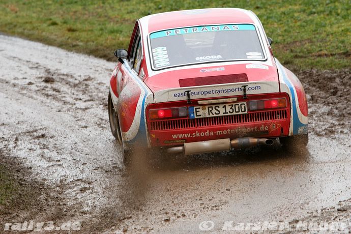 Nachdem wir 4 Jahre bei der Rallye Kempenich ausgesetzt haben, wollte Petra es dieses Jahr unbedingt noch mal versuchen. ( siehe auch Bericht von 2004 ) Von Übelkeit auf dem Beifahrersitz war aber diesmal keine Spur und so konnten wir die Rallye ohne Probleme beenden. Da in Kempenich straßenzugelassenen Reifen vorgeschrieben sind und wir im Vorfeld weder Rennreifen mir E-Kennung noch normale Straßenreifen kaufen konnte, weil unsere Reifengröße nicht mehr hergestellt wird, hofften wir auf trockenes Wetter. Das war auch am Samstag bei der technischen Abnahme der Fall, aber die Rallye startete leider erst am Sonntag. So gingen wir im strömenden Regen mit 7 Jahre alten Straßenreifen an den Start und mussten die WP´s halt auf Sicherheit bestreiten. Dennoch haben wir das Beste aus der Situation gemacht und sind als Zweiter in Klasse ins Ziel gekommen. Ein Ergebnis, das sich bei den beschriebenen Umständen durchaus sehen lassen konnte. Leider zählt die Veranstaltung in Kempenich nicht zur Youngtimer Trophy und daher gab es auch keine Punkte für die Jahreswertung. Dennoch hat es riesen Spaß gemacht, wie man an Hand der Bilder sicher erkennen kann.